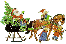 Aus dem Schlitten vor dem Haus, steigt der Weihnachtsmann heraus.